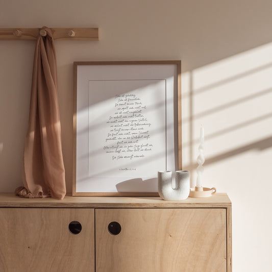 Liebe versagt nie, 1. Korinther 13 - Poster DIN A3 | Bibelvers Deutsch