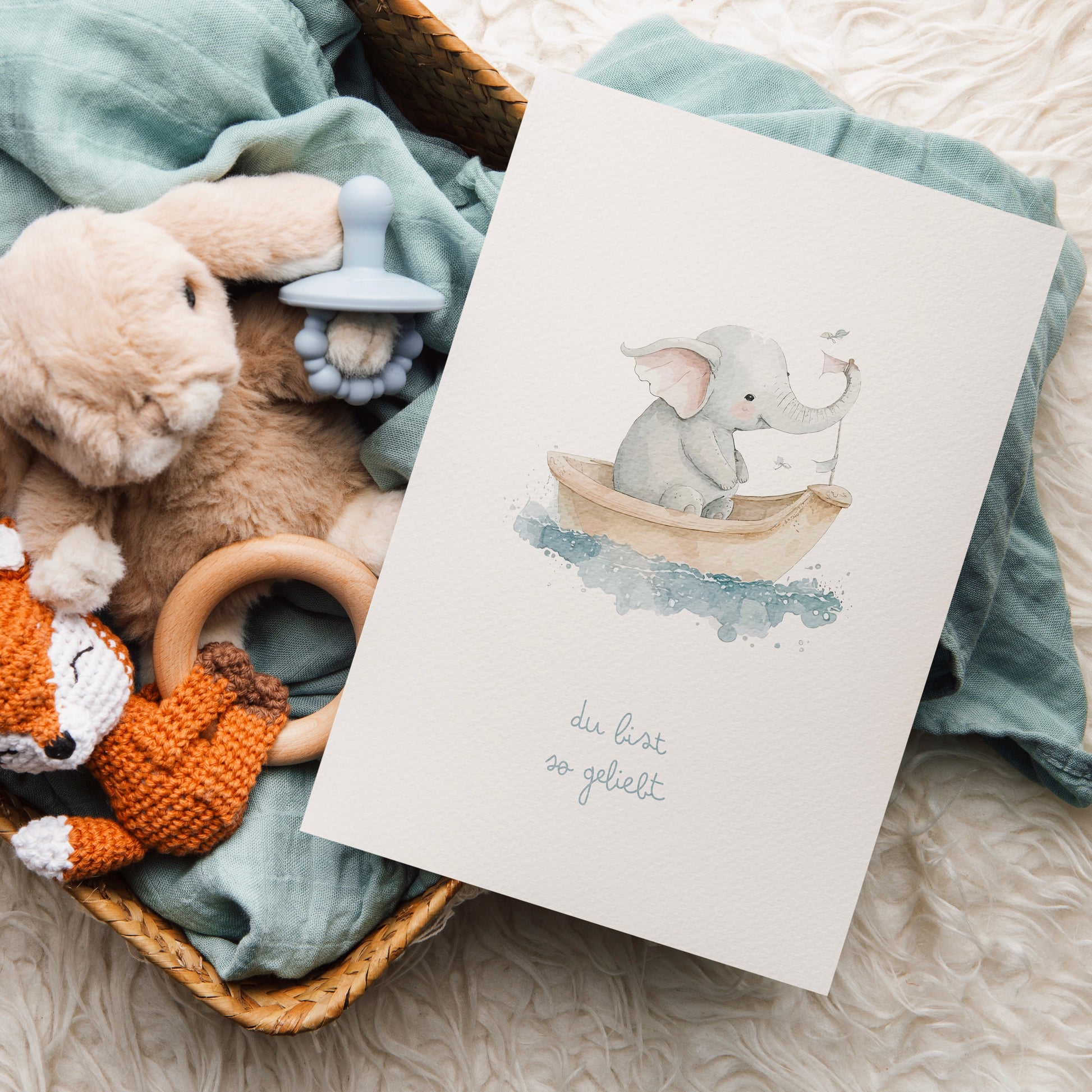 Das zarte Aquarellmotiv mit dem kleinen Elefanten in seinem Boot macht die Karte zu einem besonderen Blickfang – ideal zum Verschenken oder Einrahmen.